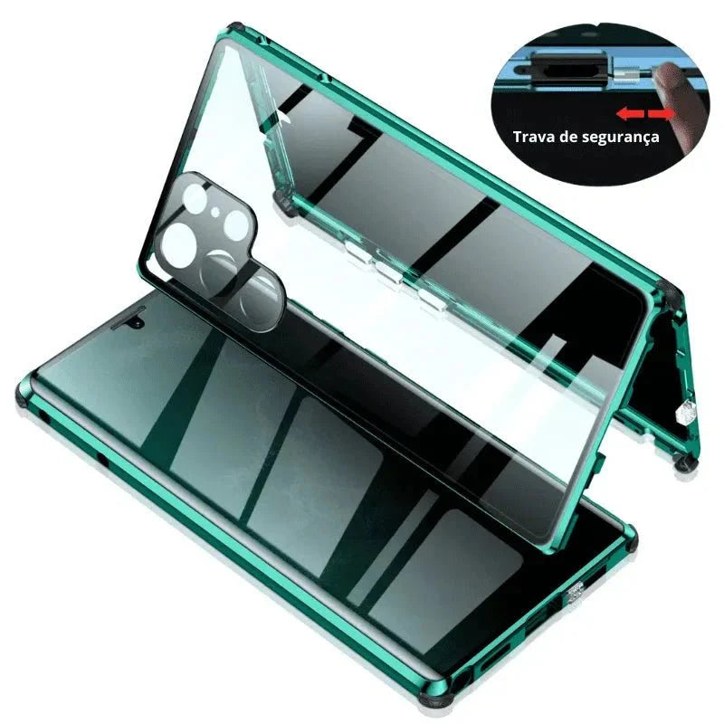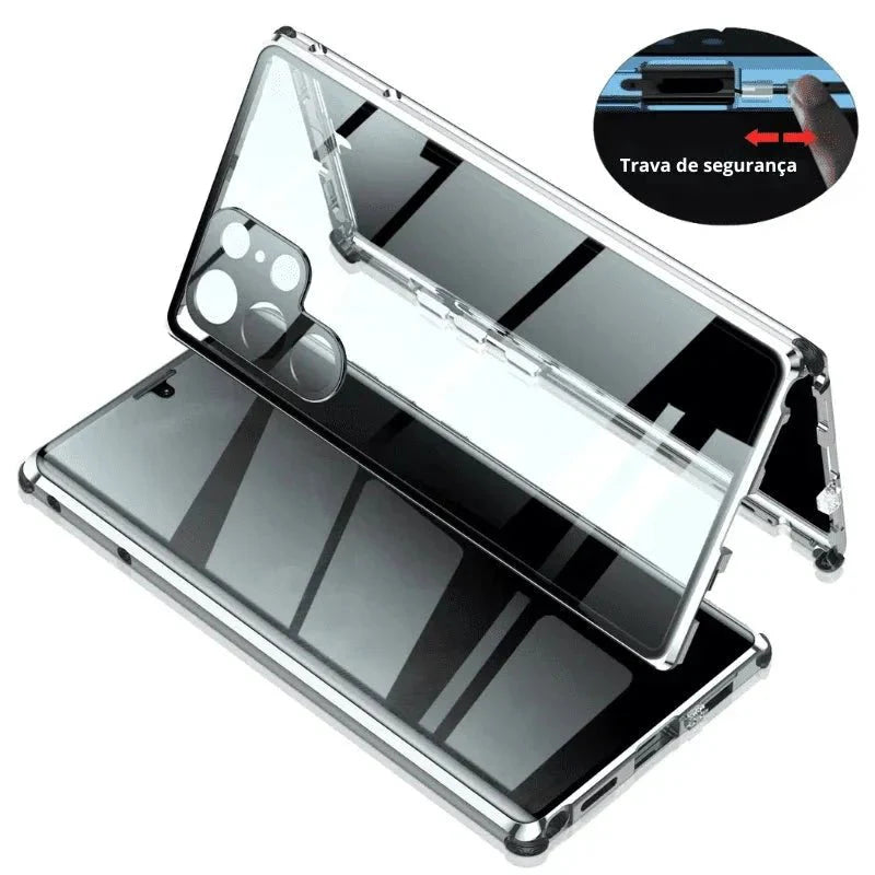 Diferente das cases comuns, essa solução oferece proteção dupla real: frontal e traseira com fechamento magnético seguro e visual elegante. Evita danos físicos e protege sua intimidade.