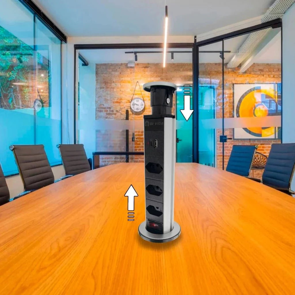 Chega de extensões espalhadas ou múltiplos adaptadores. A torre retrátil foi feita para centralizar todas as suas conexões em um único ponto, sem comprometer a estética do ambiente.